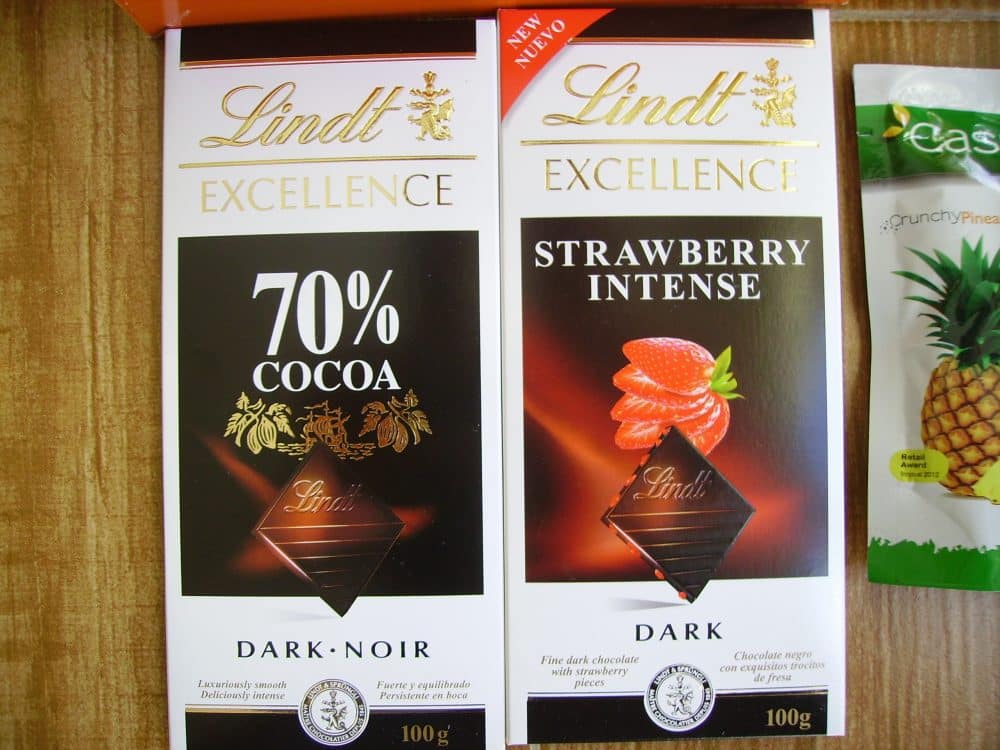 - 2 tabletas de Lindt: Excellence Strawberry Intense, Excellence 70% Cacao.